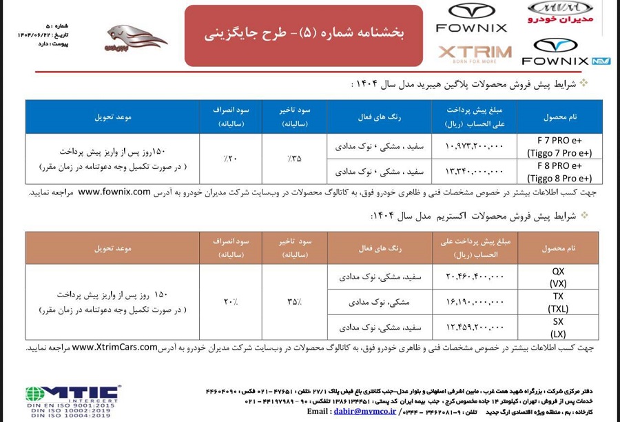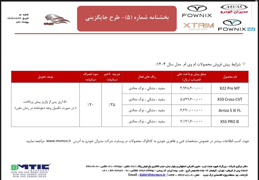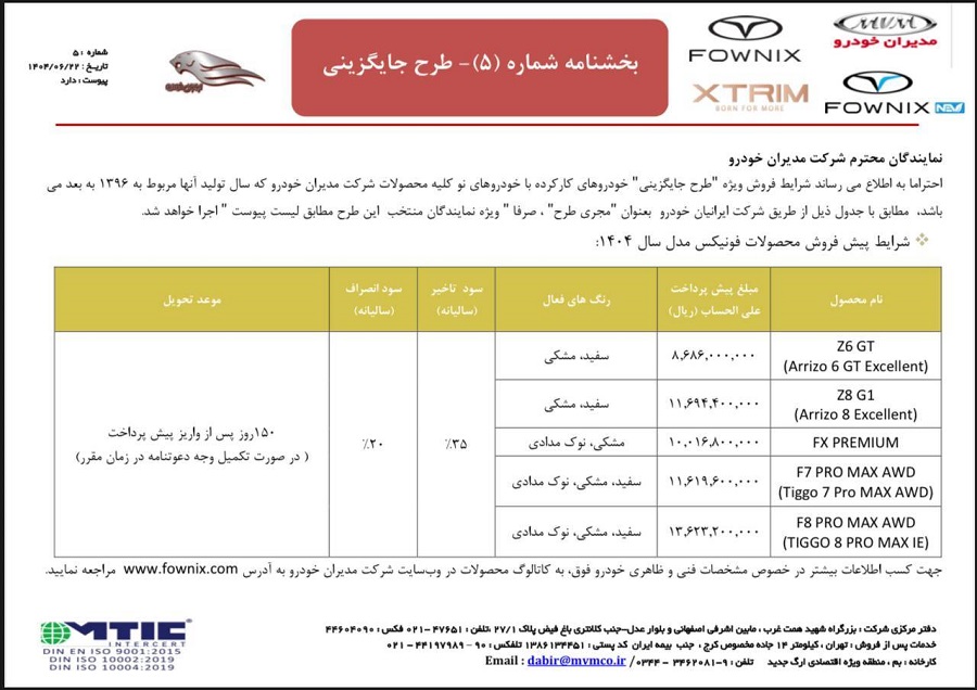 شرکت مدیران خودرو شرایط فروش محصولات ام وی ام و فونیکس را ویژه شهریور ماه ۱۴۰۴ با نام های جدید اعلام کرد.