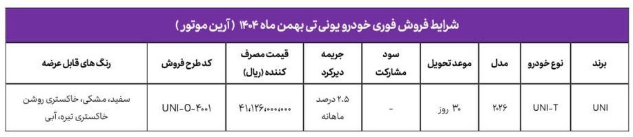 این خودرو با قیمت قطعی چهار میلیارد و 112 میلیون تومان عرضه میشود و در رنگهای سفید، مشکی، خاکستری روشن، خاکستری تیره و آبی قابل انتخاب خواهد بود. موعد تحویل خودرو 30 روزه و جریمه تأخیر در تحویل هم 2.5 درصد ماهیانه است. این شرایط فروش چانگان یونی تی از ساعت 12 ظهر روز شنبه مورخ 25/11/1404 شروع میشود و تا زمان تکمیل ظرفیت ادامه دارد. ثبتنام بهصورت اینترنتی با مراجعه به آدرس sales.arinadrive.com صورت میگیرد.